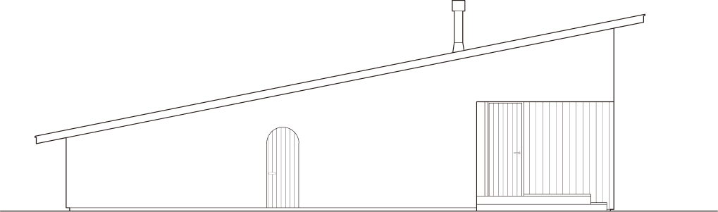 土間仕上げの「火の間」と「エクステリア・ダイニングスペース」を携えた、1LDKのラグジュアリープラン。短手では緩やかな勾配の長屋根がAARDE特有の美しいプロポーションを生み、左官仕上げの外壁に穿たれたアールの木製扉が可愛らしさのアクセントとなっている。絵本の様な扉の向こうには、エクステリア・ダイニングスペース、庭、長手の縁側がまるで別世界の様に拡がっている。長手のプランをスライスするように引かれた対角線は、この特別な外空間とLDKを強く結びつける為の重要な意匠となっている。※規格住宅ではありません