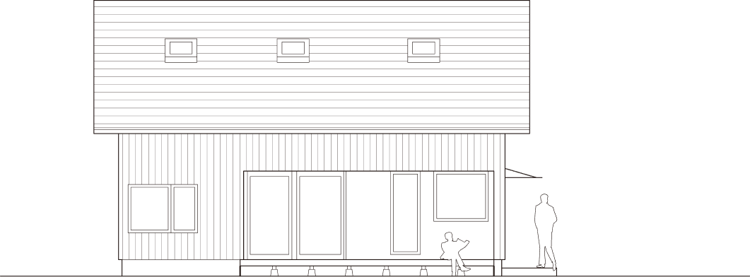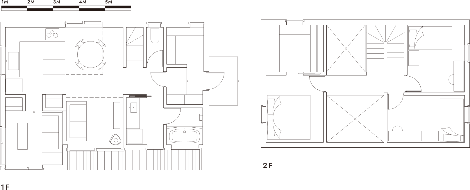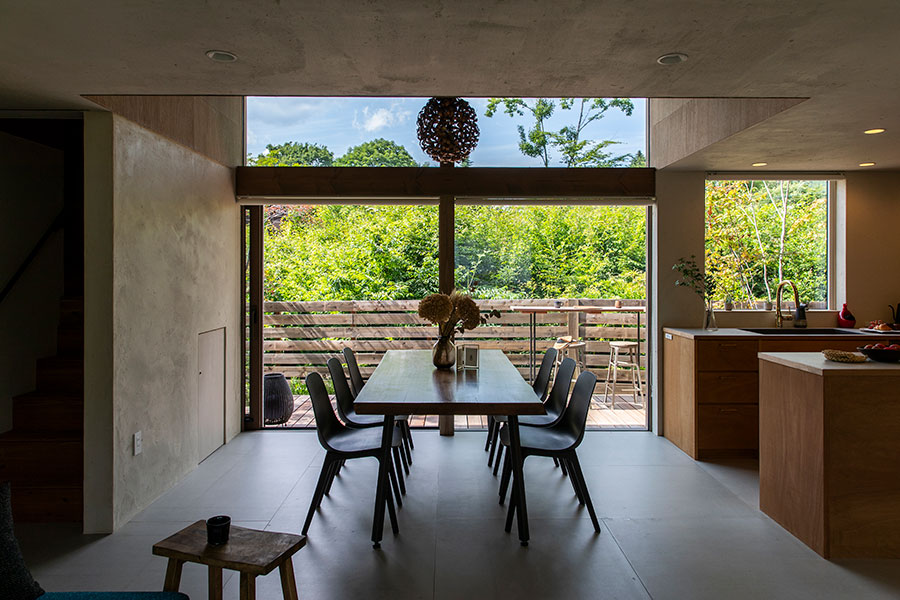 HUIZEN HUISJE 3LDKプランの1つ。元来、宿泊施設として計画されたプラン。性質上必要であった広い玄関土間収納は使い易さの観点からそのまま踏襲された。1階部分は4つのゾーニング(スクリーンルーム、リビング、ダイニング、キッチン)に分けられており、それぞれ全く異なる素材感、窓のスケール、そして天井高を持つ。各エリア、各アクティビティが、互いに存在感を主張し合いながらも、適度な間合いを取り、共存している。いつまでたっても飽きのこない、毎日を満喫させてくれる住まい。※規格住宅ではありません