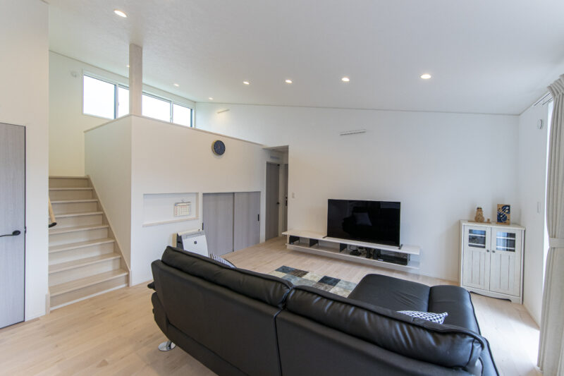 ふたりの子どもが生まれ、「そろそろマイホームを」と考えていたMさんご夫妻。ご主人が通っているスポーツジムの仲間が石田建設のスタッフだったことやジムトレーナーが同社で家を建てとても満足しているという様子から、はじめから依頼しようと決めていたという。家づくりは土地探しからスタート。土地を購入後、広さを活かした平屋のプランを同社から提案された。作業療法士のご主人は、患者さんや周りの人たちからの「将来的に2階は使わなくなる」というアドバイスを受け、そのプランに納得したが、一方で奥さまは、住み慣れた2階建ての家を希望。おふたりの思いを叶えるスキップフロアのある平屋建てという、これまでにないプランが誕生した。