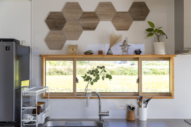 「棚が欲しい」という希望に応え、キッチンの窓枠をオープン棚風に造作。グリーンや小物などを置いて、彩りをプラス